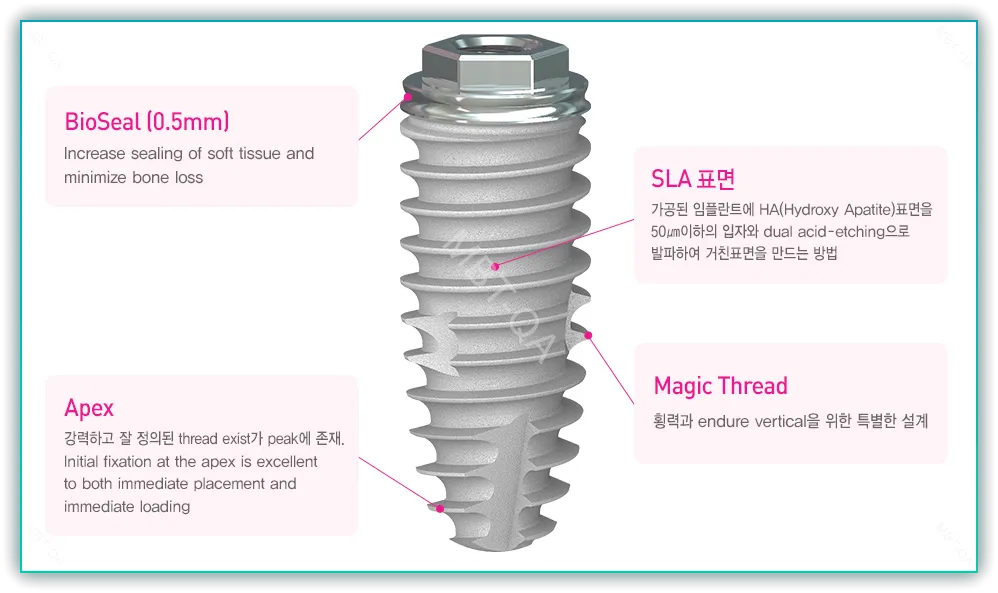 IS-III active이 2016년에 출시된 제품이며 기존 제품 대비 업그레이드된 SLA 표면처리 및 높은 초기고정력을 보여줍니다.