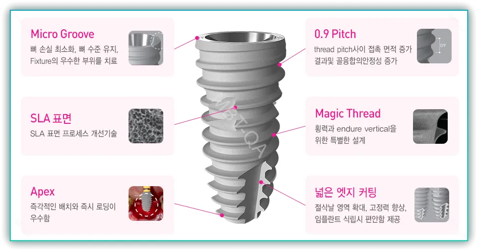 Gingiva Collar는 1.8mm와 2.8mm의 두 가지 종류로 제공되어 다양한 치은 높이에 적용 가능합니다. SLA. Surface 공정 기술의 개선으로 세포 부착력이 1.5배 증가하였으며, 이로 인해 골유착 기간이 단축되었습니다.