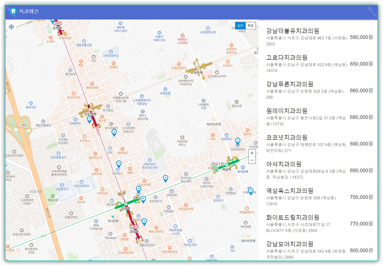 치과웨건이라는 웹사이트에서 네이버 지도 기반으로 가격 정보를 쉽게 검색할 수 있습니다. 모든 치과 정보가 나오지는 않으며 최저가로 자동 나열되서 쉽게 검색할 수 있습니다.